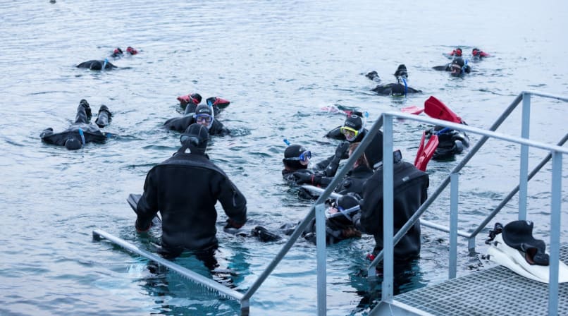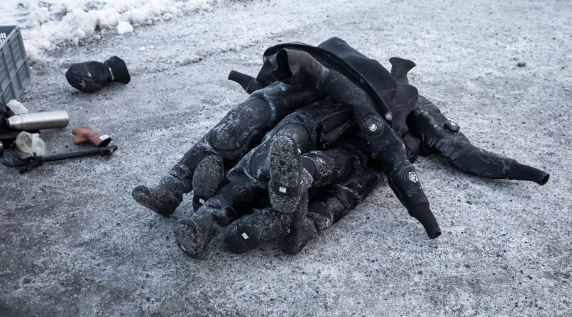 Next came the pièce de résistance. After a short break for lunch and a 30 minute drive, it was time to do the unthinkable. In the biting -10°C midwinter, we layered up, pulled on our drysuits and mentally prepared ourselves for the plunge. On went the flippers, de-misting spit was applied to the goggles, and we were ready to go. “What am I doing?” I pondered.