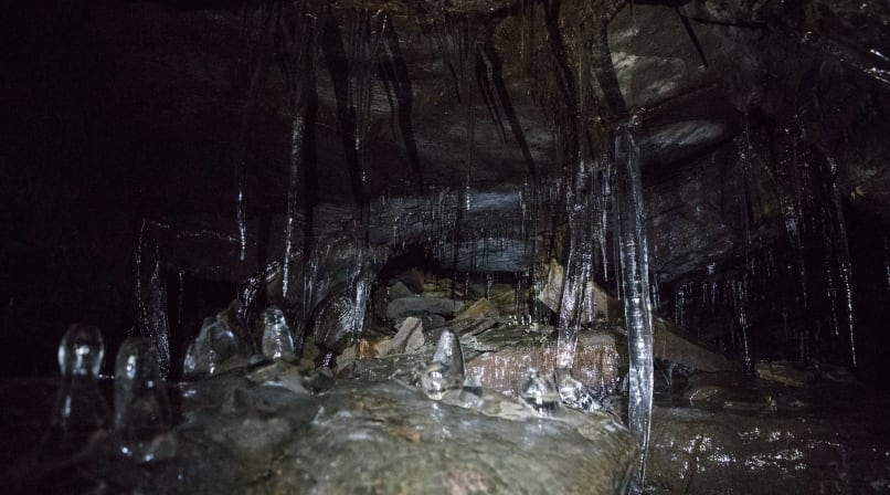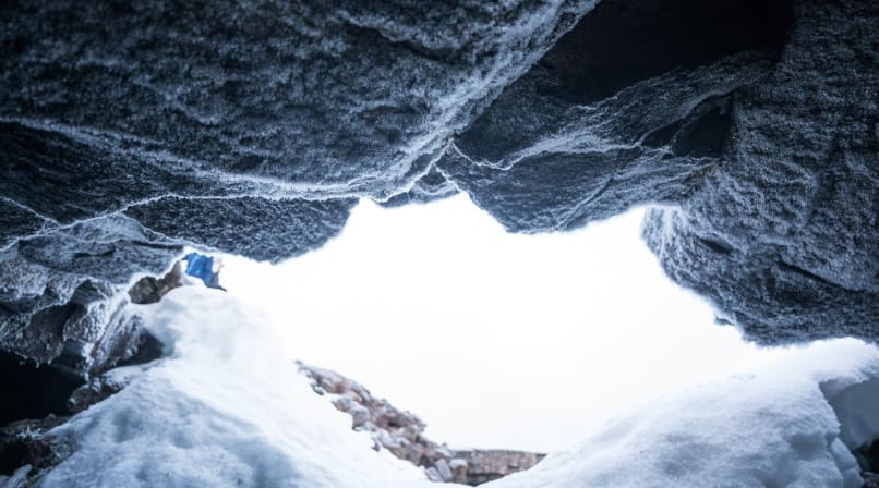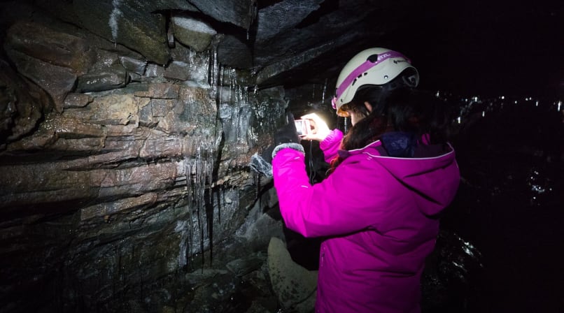 When we arrived, we were greeted by a stunning sunrise; the winter morning’s pink and blue hues accentuated by the desolate white-out of the snowy landscape. After navigating the cave’s treacherous, icicle-ridden entrance, the magma-smoothened walls and the ashen floor could be appreciated, with both serving as a reminder of the chaos that once occurred within. The ceiling, comprised of myriad drip stalactites, strangely resembled the wood-chip wallpaper your grandma used to have, only beautiful and igneous, not trashy.