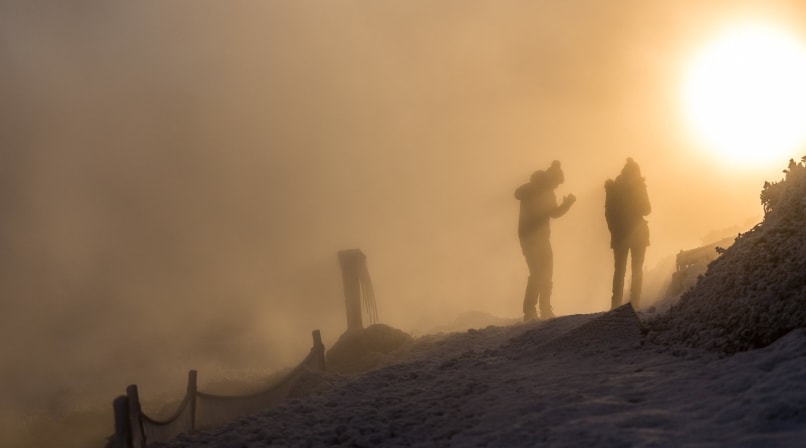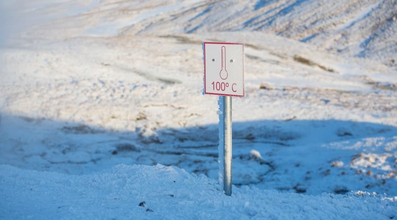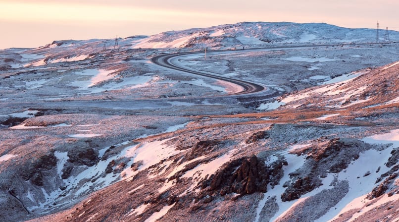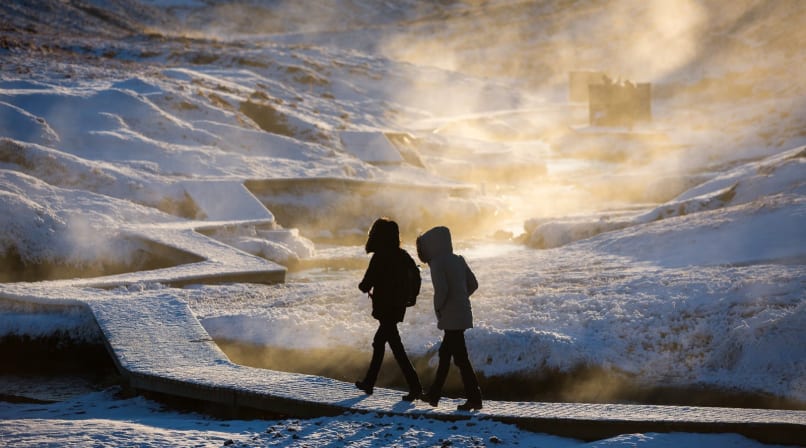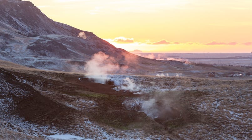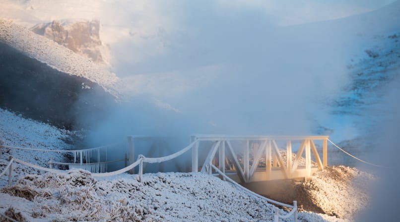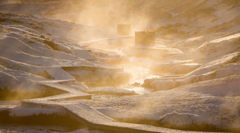 Reykjadalur (“smoky valley”, in English) is located near Hveragerði, Europe’s capital of hot springs. As we approach the town over the Hellisheiði mountain pass, the surrounding mountains and fields are decorated with telltale columns of white steam. It’s a beautiful day—the sky is clear, the sun is rising, and the snowy mountains shine with pink sunlight in the freezing morning air.