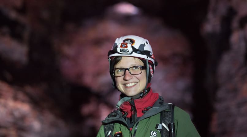 As we trek into the wet and dimly-lit cave, I wonder how this massive tunnel came to be. Our knowledgeable and experienced guide, Kaśka, is there to answer all of our questions. The eruption that created the lava flow and formed the cave occurred over 4,000 years ago. Molten lava flowed along a passage, collecting along all sides of the channel, before cooling, expanding and eventually hardening to create the cave roof. When the lava flow stopped, it left behind this concave tube, creating Raufarhólshellir. Oxidized elements from the eruption created the vivid maroon shades that characterise the tunnel, frozen in a dripping candle-wax effect.